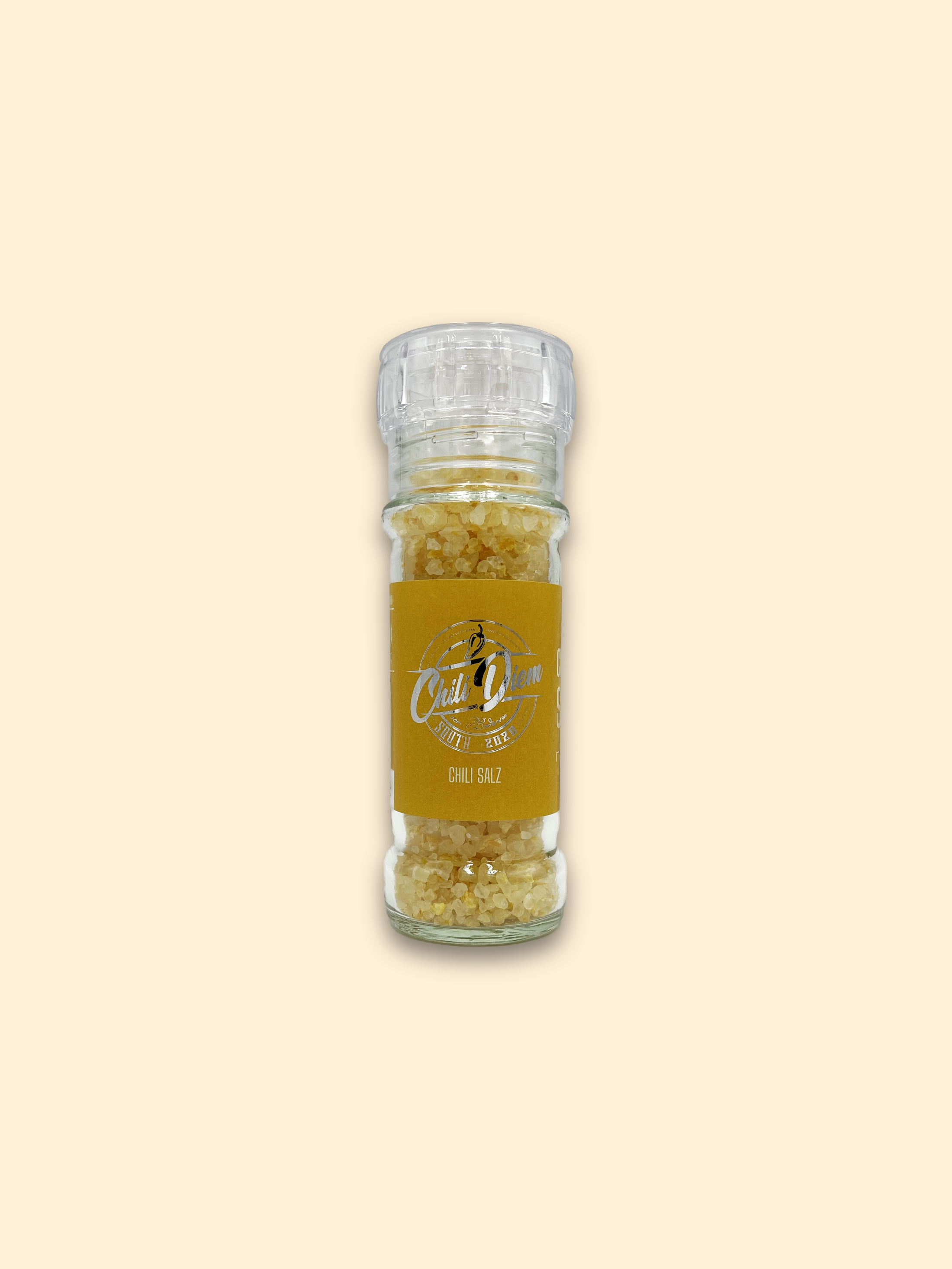 Gelbes Chilisalz von Chili Diem mit einzigartigem Geschmack im bequemen Salzstreuer.